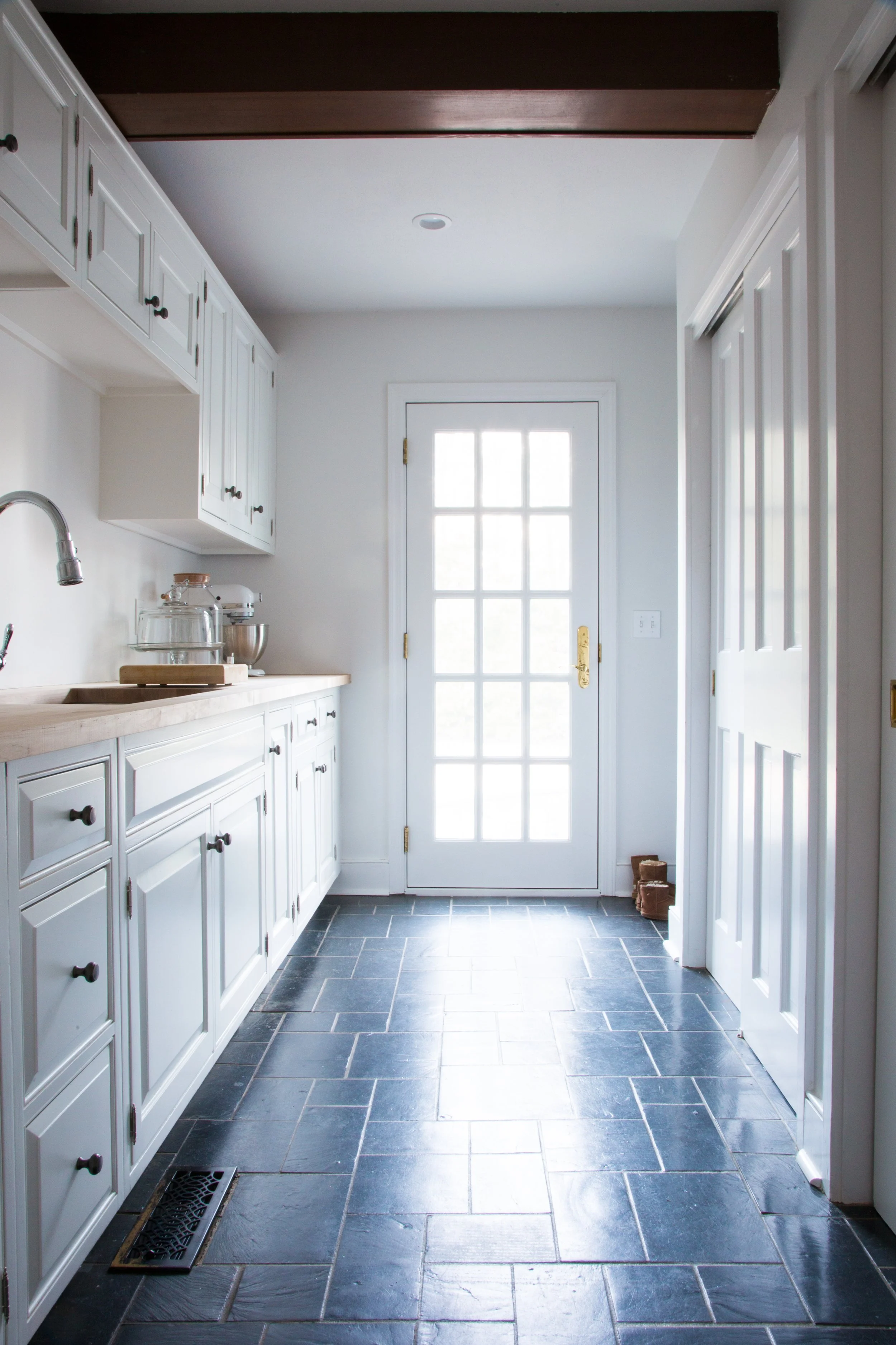 One of the most dramatic transformations happened in the kitchen. The original wood cabinetry felt a bit too country for Amanda’s taste, though the layout and appliances were still functional. Rather than gut the space, the team opted for a lighter touch: painting the cabinetry and updating the hardware and lighting for a cleaner, fresher look. The adjacent family room was also brightened and refreshed, and is now where the family spends most of their time. (Images 2 & 4 show the “before.”)